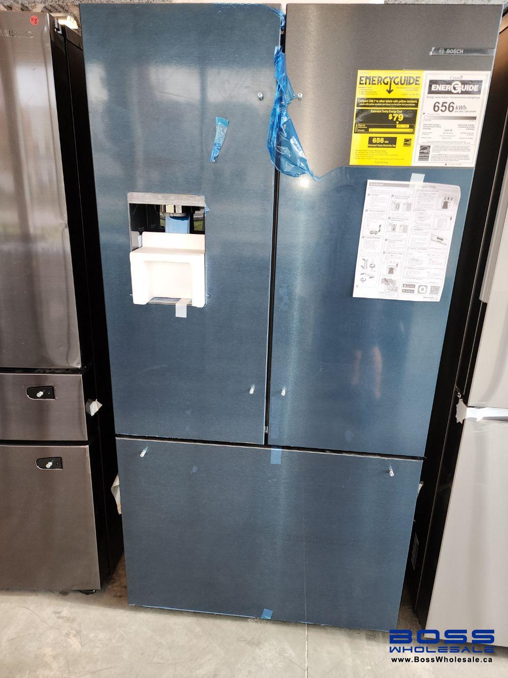 Ensure your food and beverages stay cool and fresh with the Bosch 36'' refrigerator. Featuring the QuickIcePro system, it can make and dispense fresh ice rapidly. Its interior has 4 adjustable shelves, door bins and a crisper to keep your produce fresh. Built-in Wi-Fi and Alexa and Google Assistant compatibility allow for remote and voice control.New item, no flaws, box damage only.